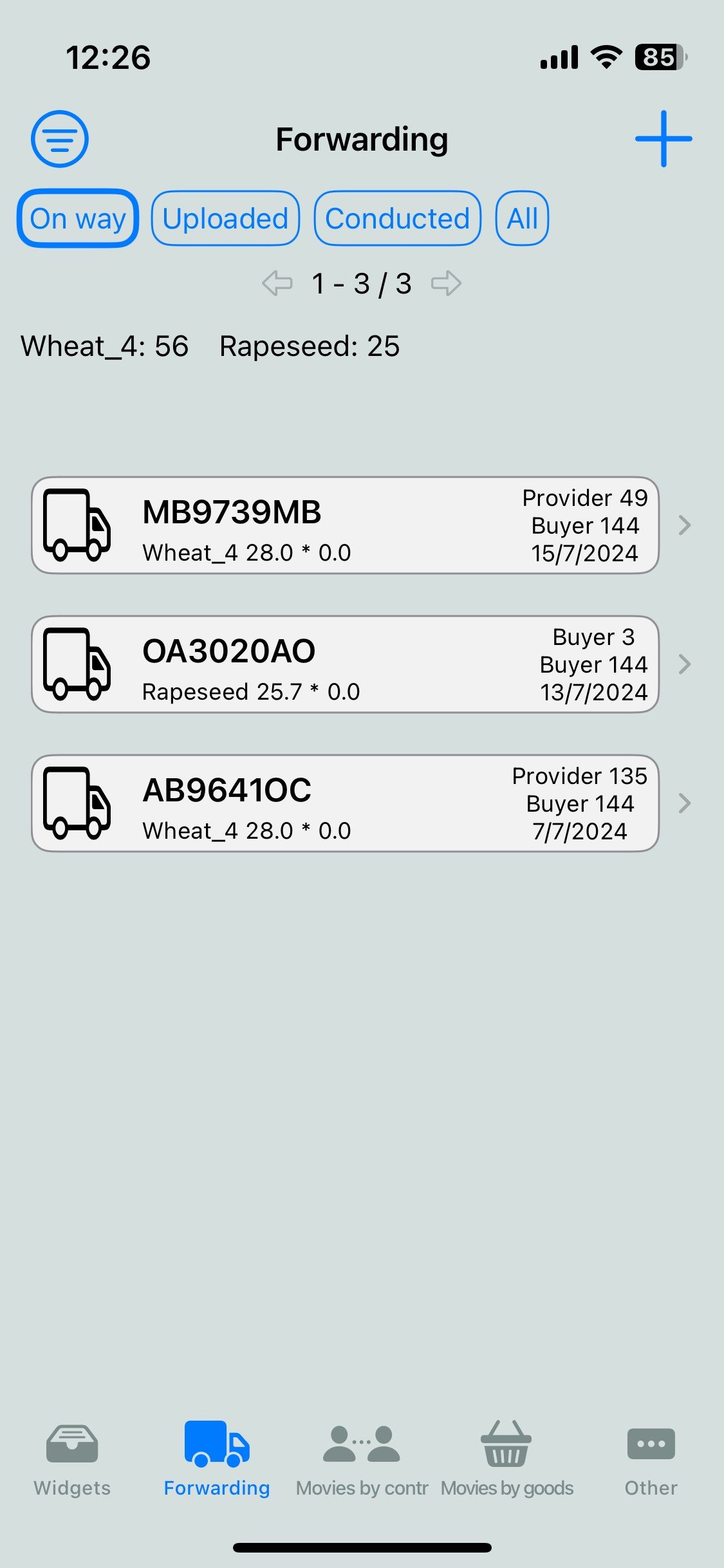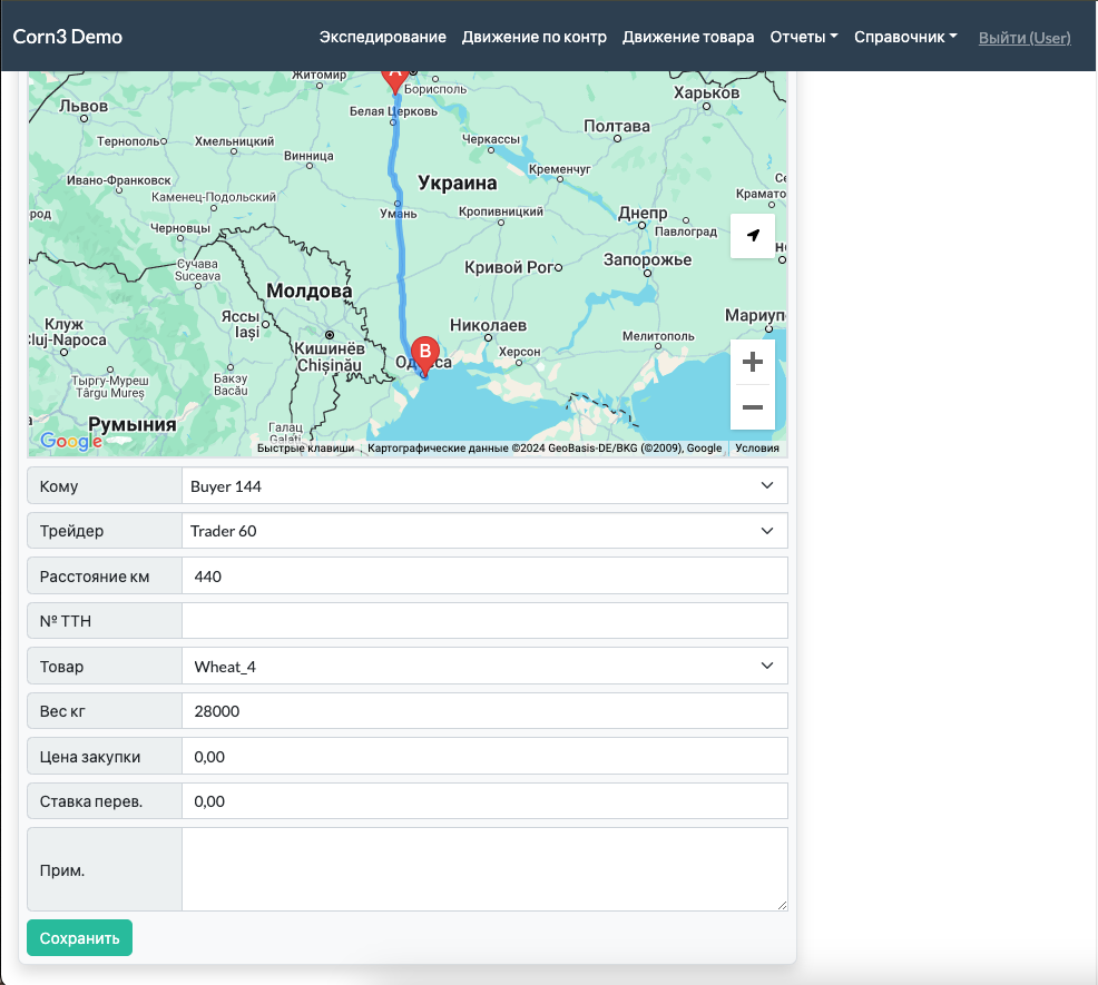 Раздел позволяет отслеживать движение грузов, с полной информацией о перевозчике, местом загрузки и выгрузки. Если в справочнике "Трейдер" указана геопозиция, то можно проложить маршрут по встроенной карте. У каждой позиции устанавливается состояние: "В пути", "Выгружено", "Проведено".