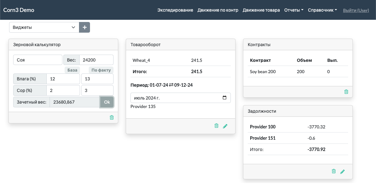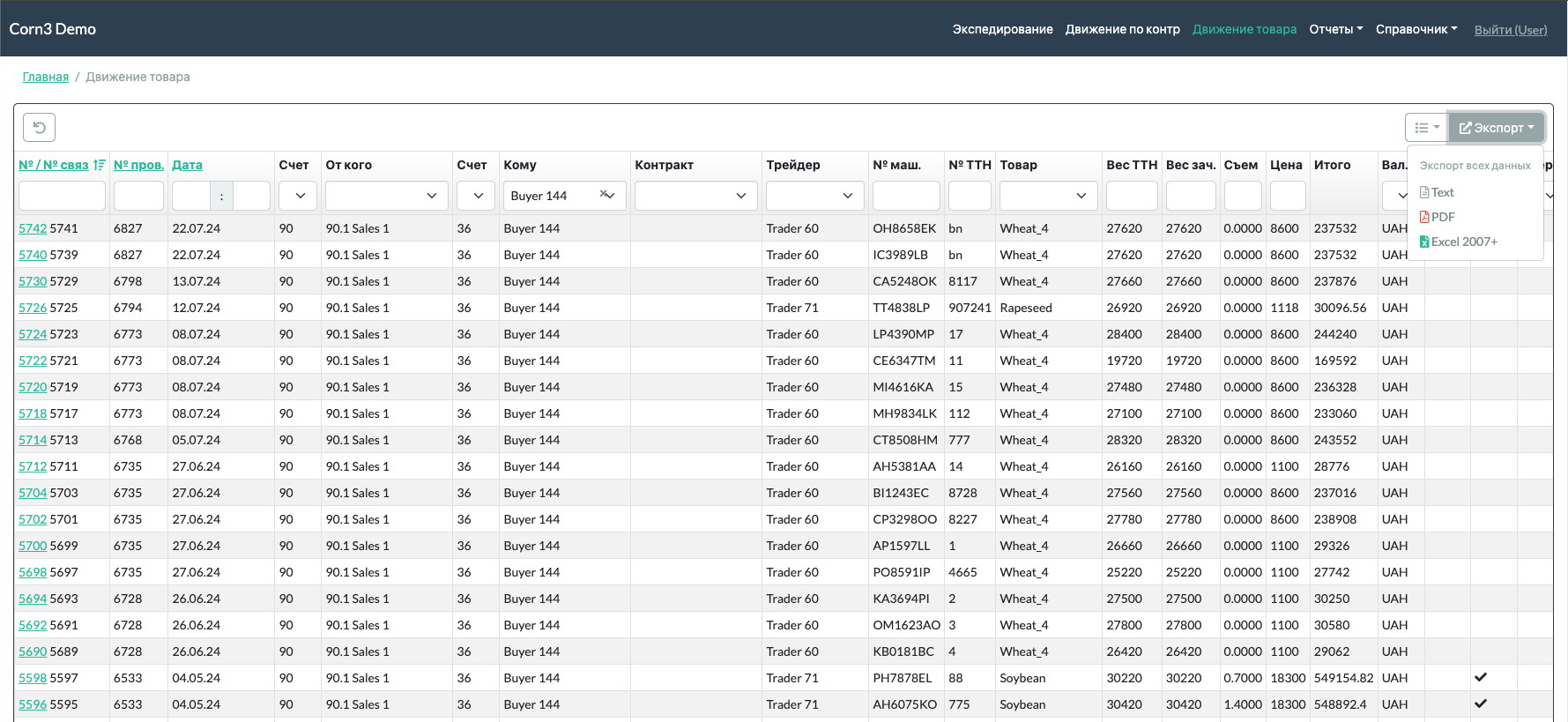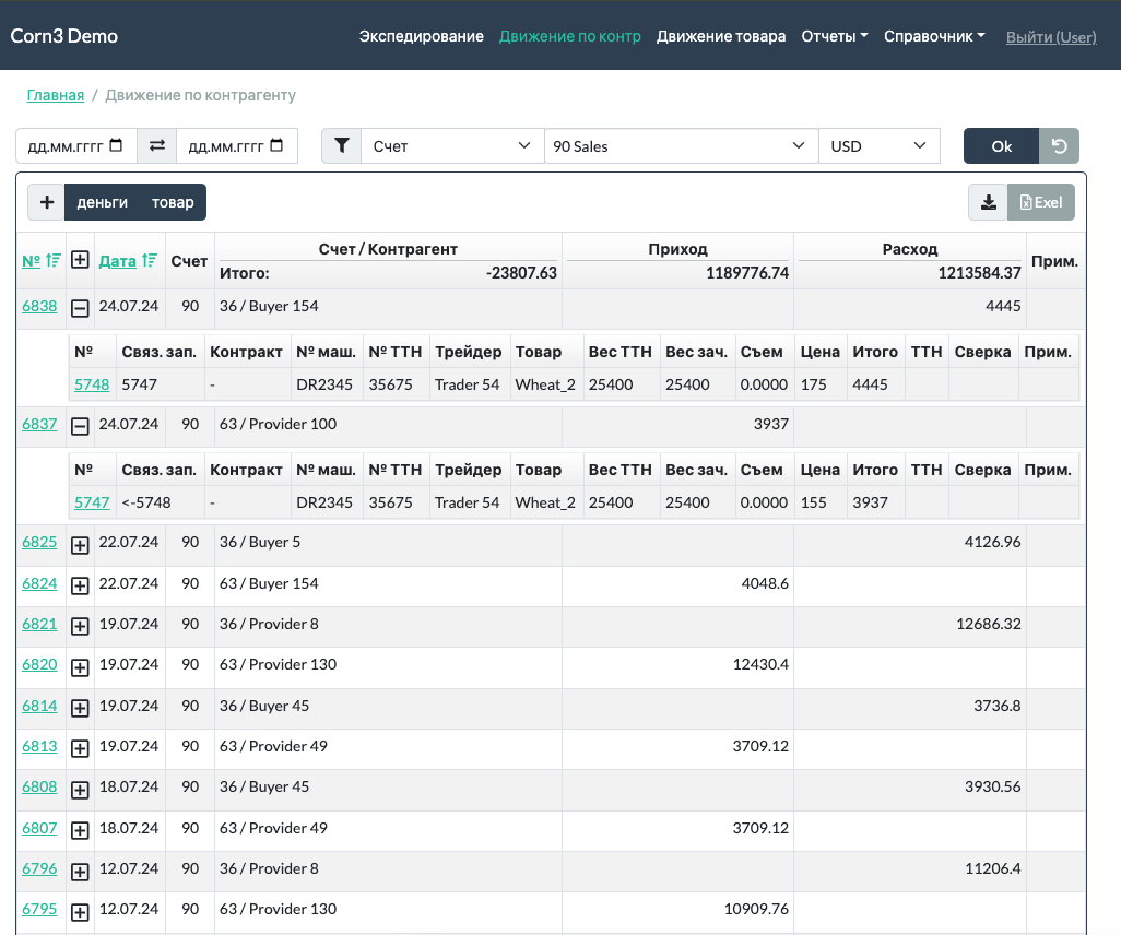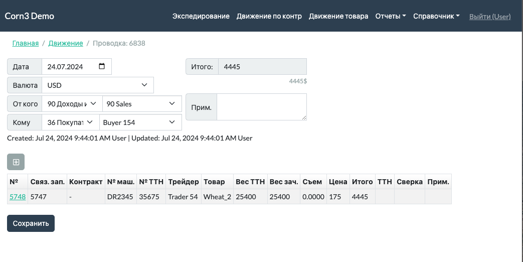 Раздел позволяет отслеживать движение грузов, с полной информацией о перевозчике, местом загрузки и выгрузки. Если в справочнике "Трейдер" указана геопозиция, то можно проложить маршрут по встроенной карте. У каждой позиции устанавливается состояние: "В пути", "Выгружено", "Проведено".